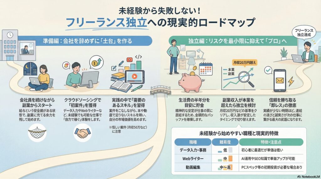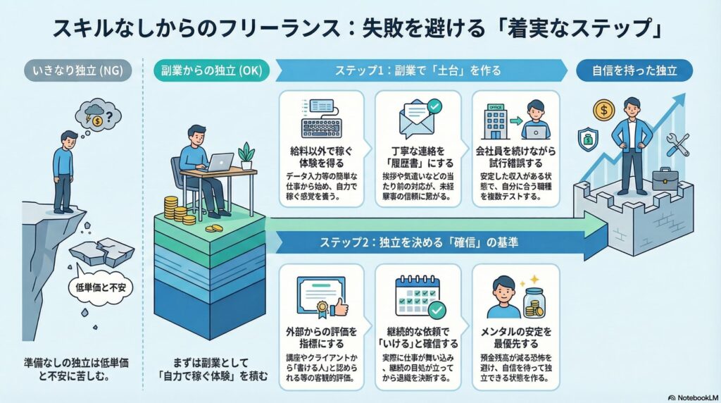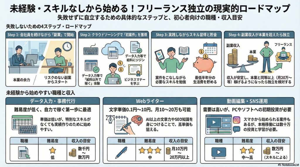 スキルなし・未経験からでも失敗せずにフリーランスとして独立するための現実的なロードマップを解説します。